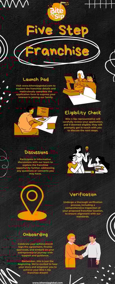 This streamlined 5-step process takes you from submitting your online franchise application through approval and onboarding. We'll review your application, discuss your goals, verify details, and guide you through the agreement process to welcome you to the Bite n Sip Family.
