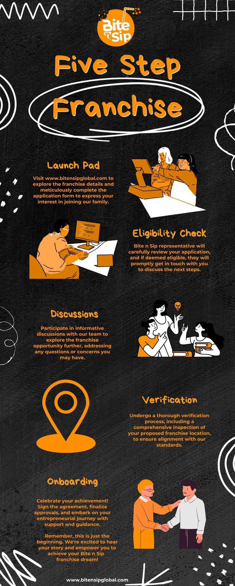 Fulfilling your entrepreneurial dream with our franchise opportunity is a straightforward five-step process. First, visit our website https://bitensipglobal.com/franchise-form and complete the online franchise application form. This form gathers essential information about your background, financial standing, and interest in Bite n Sip. Our dedicated representative team will then meticulously review your application, and if it meets our eligibility criteria, they will contact you to schedule a discussion. The next step involves in-depth discussions about your goals, market potential, and our franchise model. This open communication helps ensure a mutually beneficial partnership. Following these discussions, our team conducts thorough verification and a comprehensive inspection of your proposed location to assess suitability and compliance with our standards. Finally, upon successful completion of all previous steps, we present a formal franchise agreement, outlining the terms and conditions of the partnership. Once you approve and sign the agreement, the final stage of onboarding commences, equipping you with the necessary training and support to launch your successful Bite n Sip franchise venture.